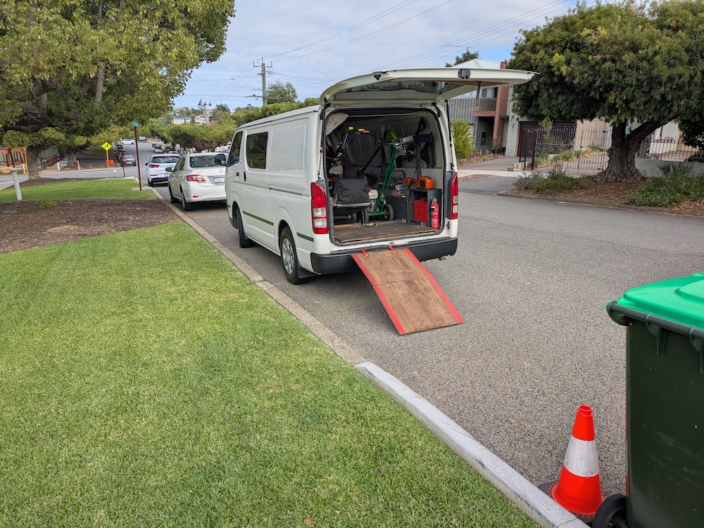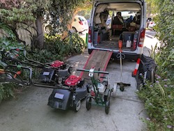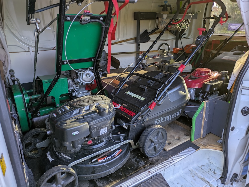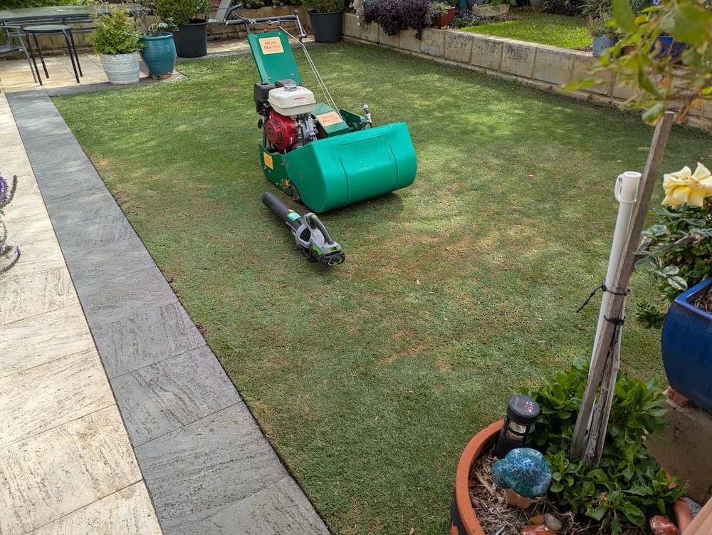 As technologies have drastically improved for cordless battery operated lawn mowing machinery, I have brought suitable machines into service as soon as possible. My current cordless lawn mowing machines are still limited to the leaf blower and the line trimmer, which are both ready for commercial use, and offer modest reductions in noise while operating, and provide total silence as I move from work area to work area, with no petrol engine running, only blissful silence.